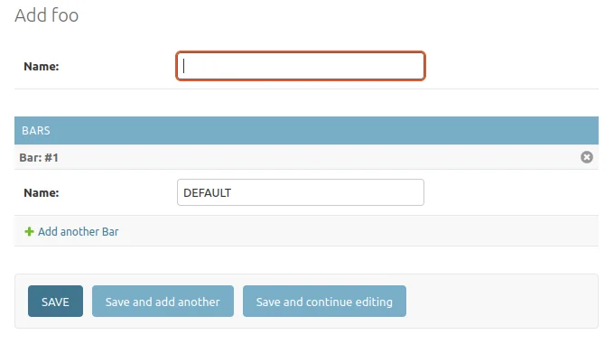 But here’s where it got tricky. When a new Foo is being added, the client wanted the first inline Bar instance to appear with a default name value, like this: